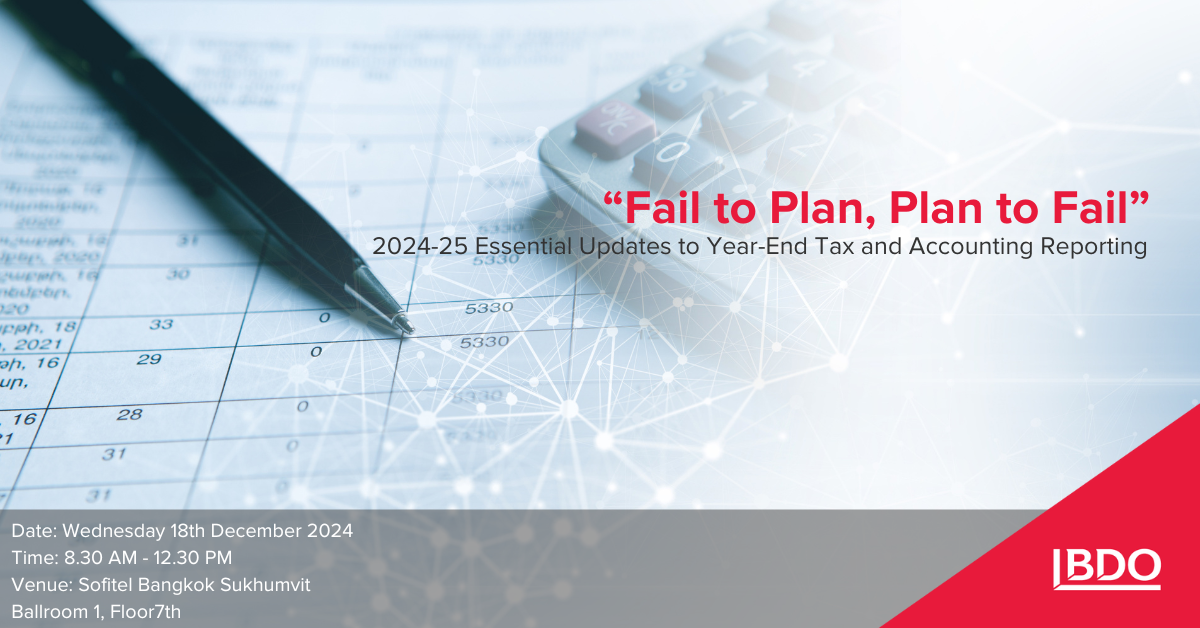 BDO in Thailand is looking forward to seeing you at our “Fail to Plan, Plan to Fail – 2024-25 Essential Updates to Year-End Tax and Accounting Reporting” on the 18th of December 2024 from 08:30 AM to 12:00 PM at Sofitel Bangkok Sukhumvit.